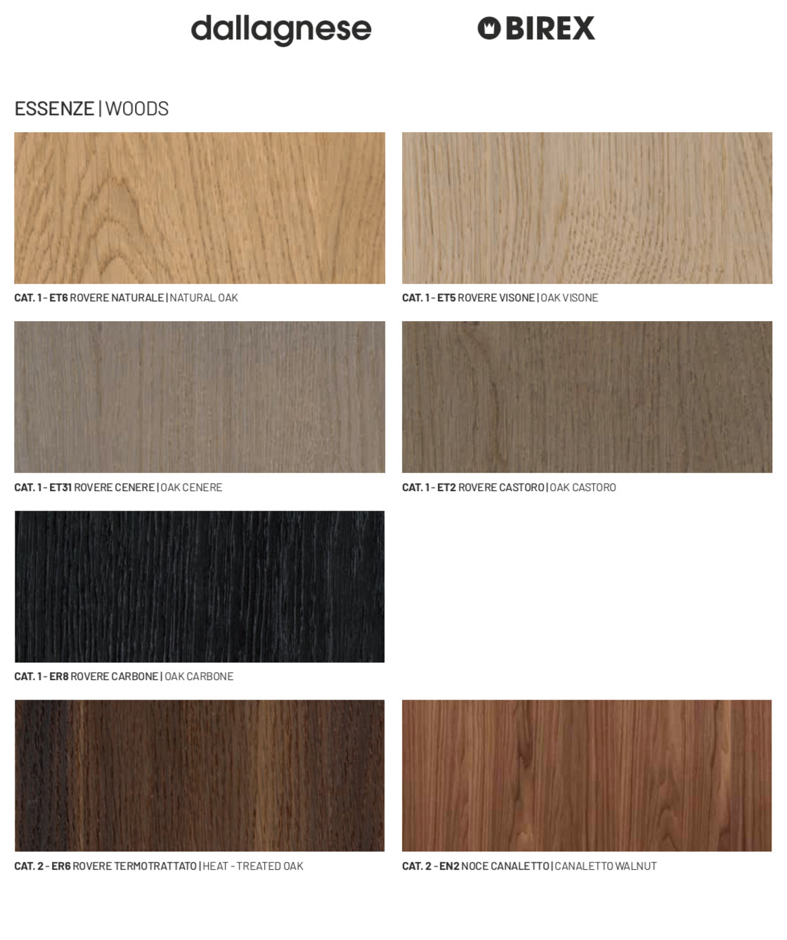 - Fronts: Made of wood particle-board panels, 20 mm th., melamine laminated, lacquered or wood veneered and varnished