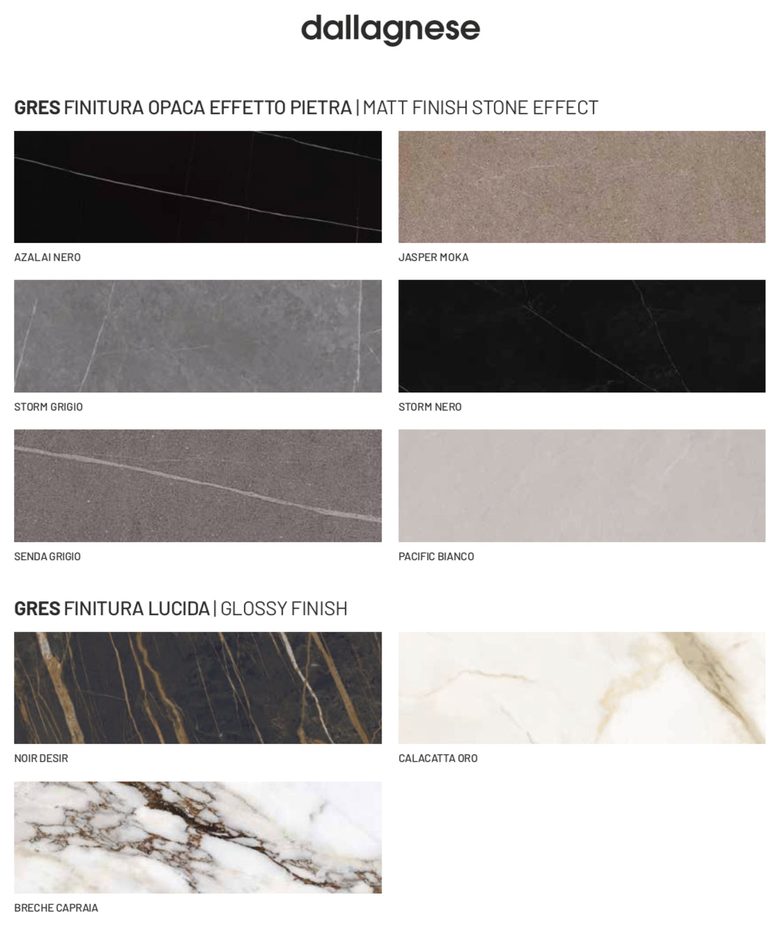 - Stoneware Top: Made of large stoneware slabs, 6 mm th., cut randomly and therefore not identical in the various top sizes