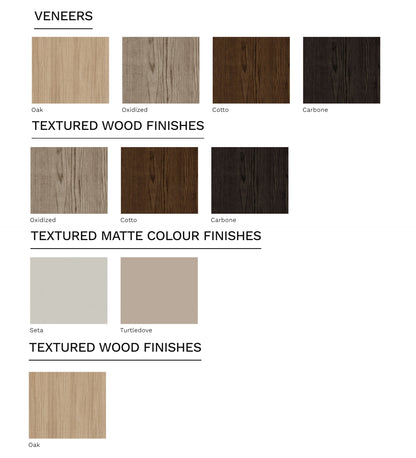 - Finishes available: Textured woods, matt colours, lacquer, mirrors, marbles, laminates, leather, glass