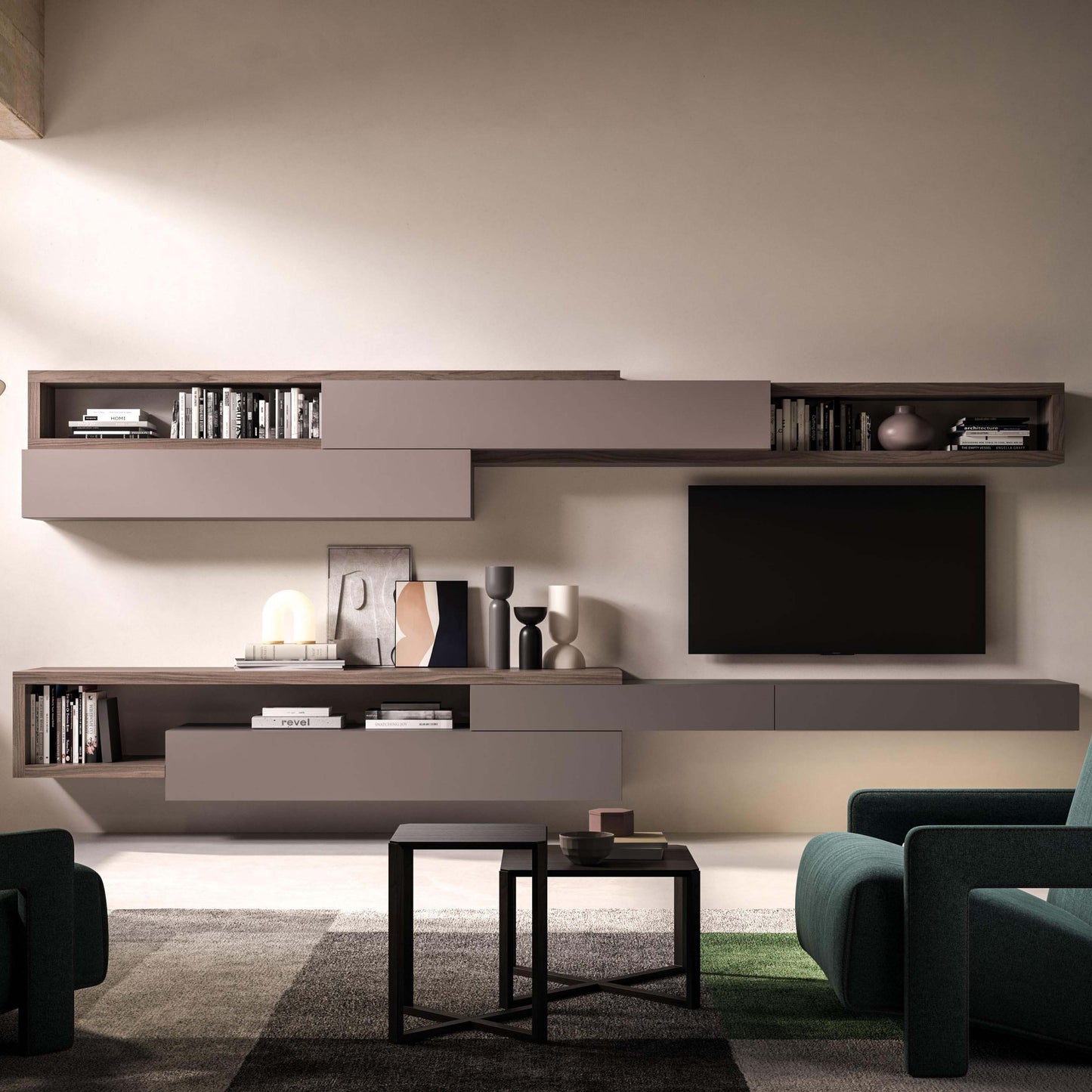 A modular bookcase and TV wall unit with Argilla lacquer and Walnut finishes. -