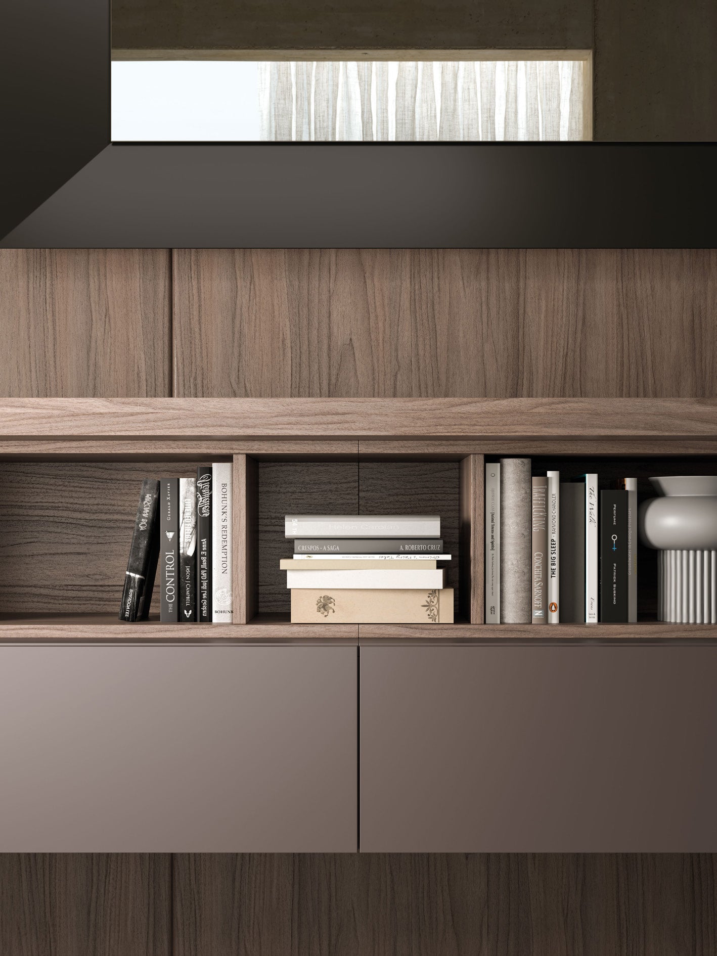 Modulo wall units in Argilla matt lacquer bring a natural, soft elegance, while Air filing cabinets in Walnut materic finish add warmth and richness. A 50mm Walnut-textured top ties the composition together, emphasising craftsmanship and durability. The thoughtful mix of closed storage and open shelving ensures an adaptable solution for books, décor, and media, perfect for modern homes seeking balance between style and function.