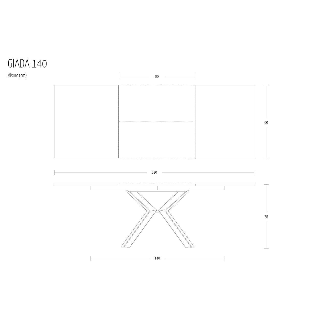 - Giada 140: L 140-220 H 75 W 90 cm