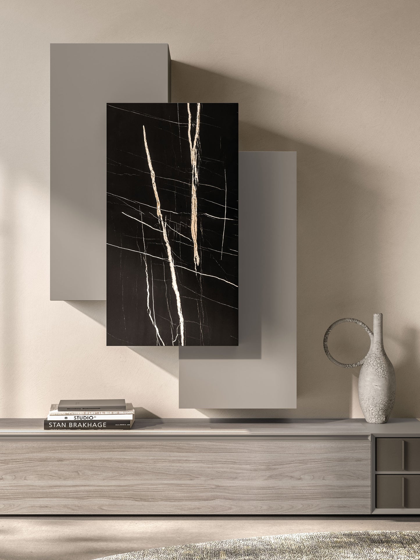 Yes—the composition is designed as a wall-mounted system with coordinating floor bases. -
