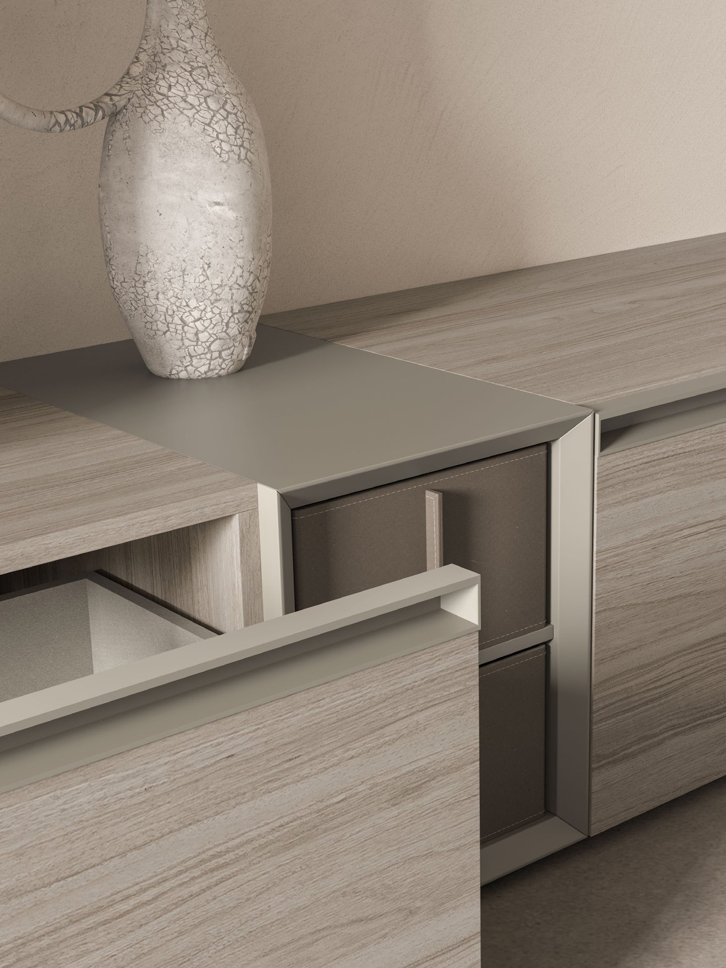 - Elegant mix of Titanio matt lacquer, Tunisi melamine and Ossidato textures.