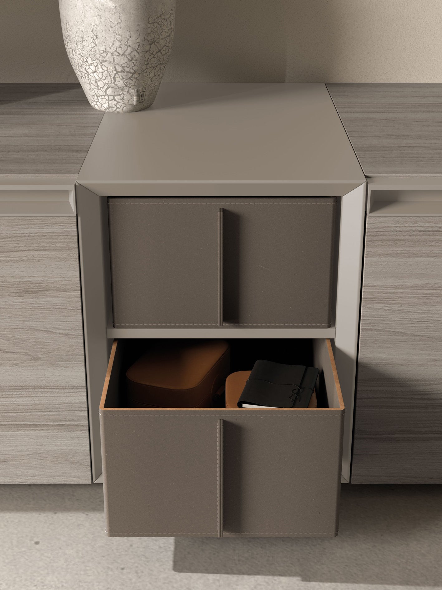 - Tactile leather drawers in the Strema element elevate the look.