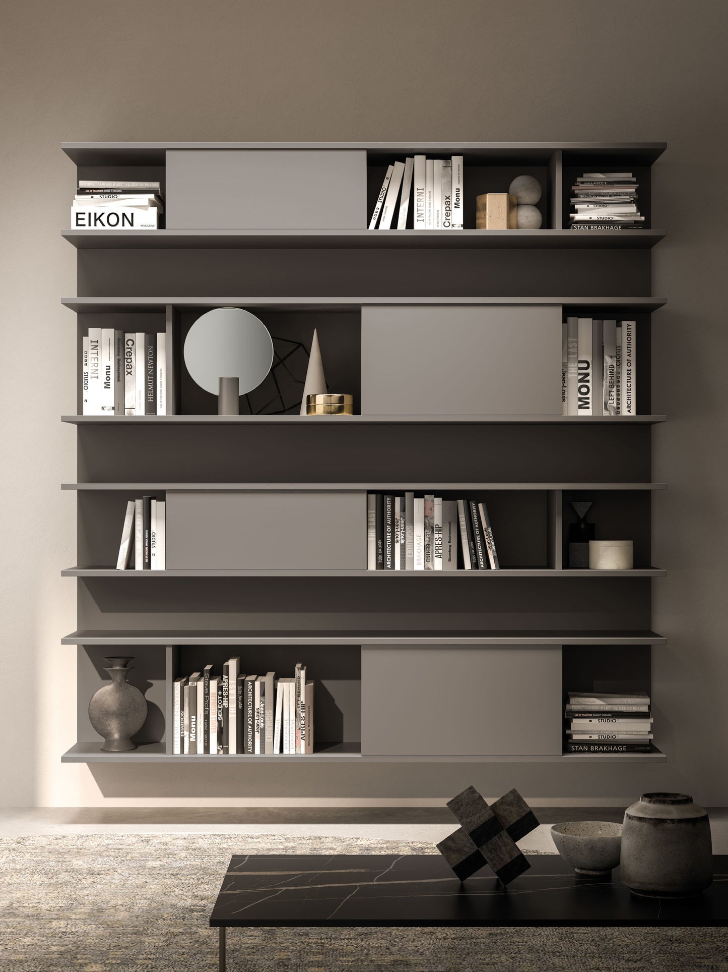 - Finish shown (images): Air / Elle units in Titanio matt lacquer; Modulo wall unit in Tunisi melamine