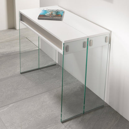 The Extendable Table Console exudes a sophisticated charm with its 18 mm Ecological laminate structure and versatile design. The front panel and top offer a delightful opportunity for personalisation, allowing one to select and combine colours distinct from the structure, thereby adding a touch of individuality to the piece. The sides, crafted from resilient 10mm tempered glass, impart a contemporary elegance.