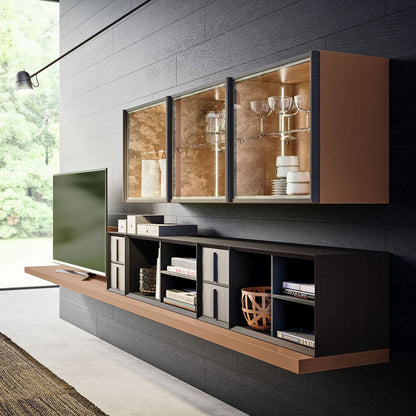 Featured in Cinnamon matt lacquer, Coal Ash, and Bronzed Glass, the unit combines wall-mounted consoles, leather-fronted drawers, and bronze glass door cabinets. The result is a sophisticated yet airy arrangement that enhances any living space. With its minimal chic design, the Day 01 composition plays with profiles, recesses, compartments, and transparent elements, creating a modern architectural feel while providing ample storage and display solutions.