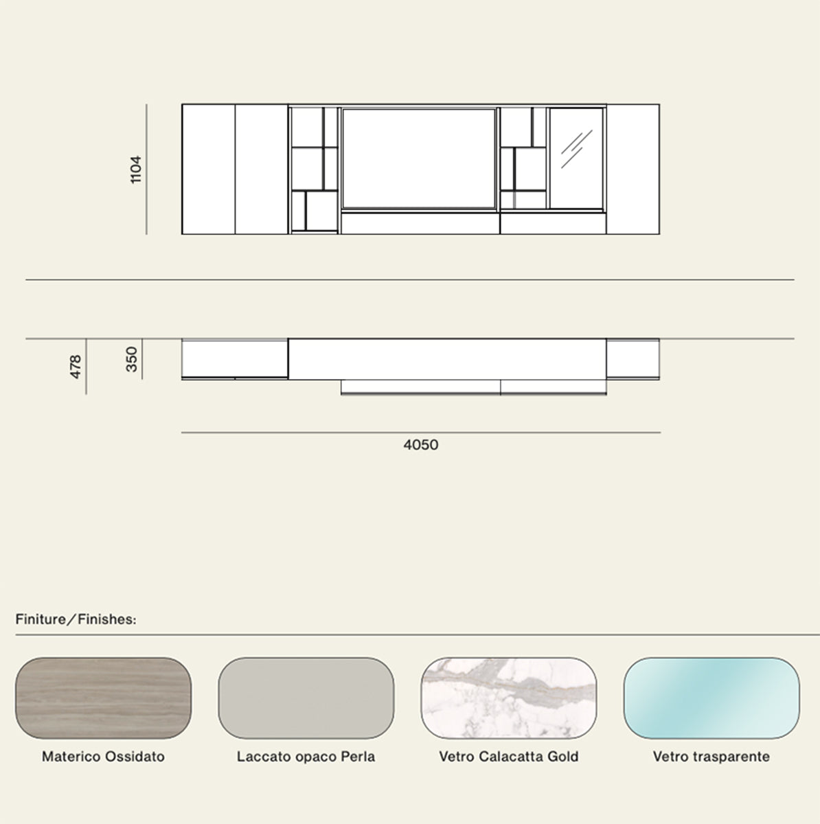9. Finishes shown (images): Ossidato wood, Perla matt lacquer, Calacatta Gold glass
