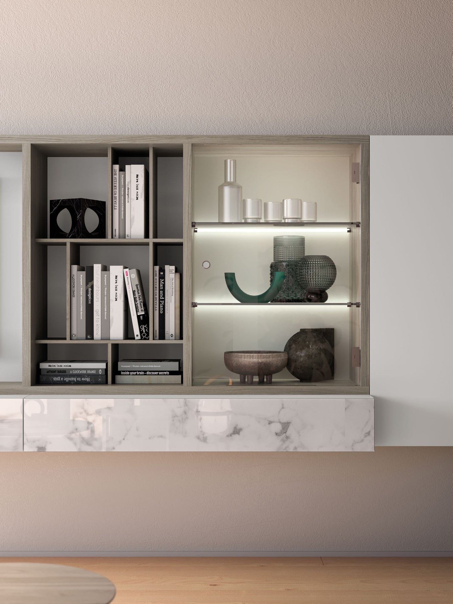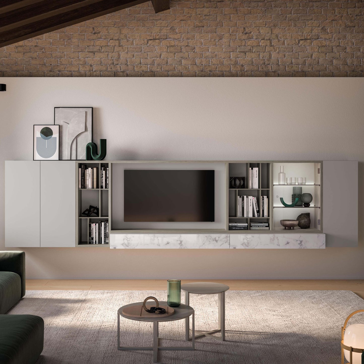 In this composition, the Urbe TV element in Ossidato wood finish is paired with a Compongo wall unit featuring Calacatta Gold silk-screened glass fronts. The Raster element, also in Ossidato wood, complements a bronzed glass showcase with backlit shelves, adding a warm glow and refined character. Together, these pieces create a sophisticated ensemble that radiates harmony, depth, and timeless Italian style.