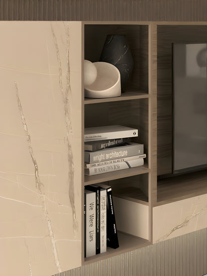 A modular TV wall system with lacquer, marble melamine, and bronzed glass details.