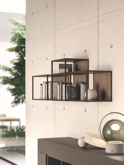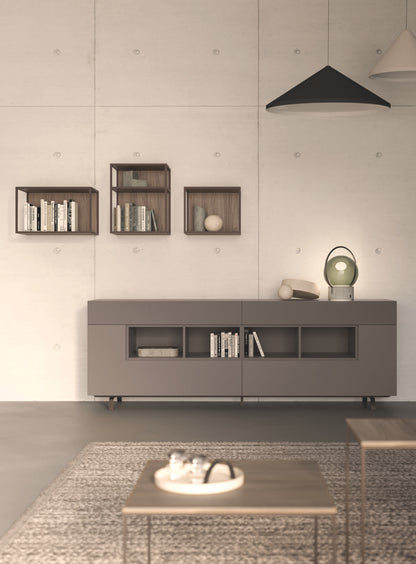 5. Finish shown (images): Modulo sideboard in Terra matt lacquer with Tiglio burnished base, Graphic wall units in Terra matt lacquer and Noce materic