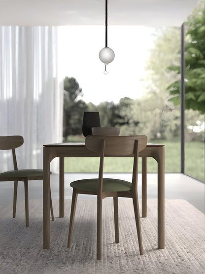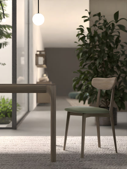 The unit features Modulo wall elements with Terra matt lacquer and Tenere marble melamine, paired with bronzed glass shelves with backlighting for added depth and atmosphere. The Modulo sideboard with Linea fronts and Elle elements in Terra matt lacquer rests on a Tiglio burnished metal base, bringing strength and elegance. Complementary pieces such as the Casellari Graphic in Terra matt lacquer and Noce materic, the Moku walnut-stained dining table, and Isotta chairs complete the ensemble, weaving a narrative of Italian sophistication and timeless style.
