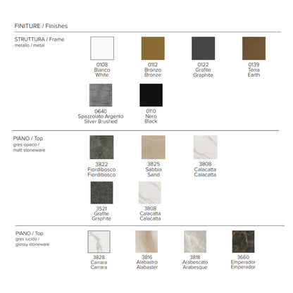 - Top: Graphite, Calacatta, Carrara, Alabaster, Arabesque, Fiordibosco, Sand, and Emperador
