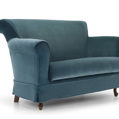 The rounded arms echo the graceful curves of the back, creating a harmonious aesthetic that invites relaxation and style into your living space. Supported by four solid wood sabre legs, subtly peeking out from beneath an elegant kick pleat skirt, this sofa is not just furniture; it's a statement of sophistication and comfort. Domingo Salotti's 070 Sofa is more than a seating arrangement; it's a testament to the artistry of fine furniture.