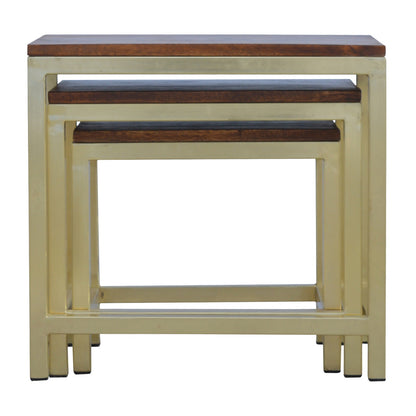 The trio of stools serves as an ideal home accent. Crafted from 100% solid mango wood, the tabletop boasts a rich chestnut finish complemented by an exquisite brass gold base. With three distinct sizes, they offer versatility, allowing you to use them together in one room or separately in various spaces. Their stackable design adds convenience to their appeal.