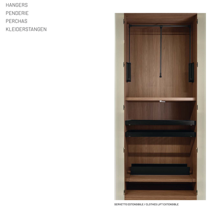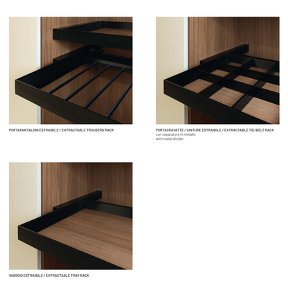 - Internal drawers available in various widths, matching the sizes of wardrobe units. These are stackable to create endless variations and come with fronts in wood or grey transparent glass framed finish. - Vertical built-in lamp with a movement reading sensor.