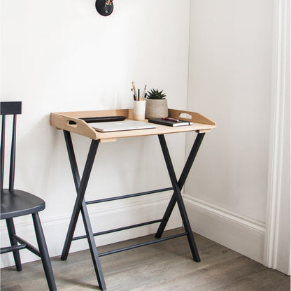 The Clockhouse Desk Tray is a chic and versatile workspace solution that effortlessly combines style with functionality. Its blend of Oak and painted Beech creates a striking contrast of materials and colours, exuding a sophisticated appeal. Coated with a protective layer of hard wax oil, it ensures durability while adding a touch of elegance. The foldable legs, finished in a contemporary off-black Carbon shade, further enhance its modern aesthetic.