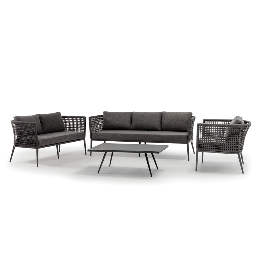 - Aluminium set with two armchairs, one sofa 3 seaters, covered with Ø 6 mm polyester rope, and a table with aluminium top, upholstered cushions with acrylic fabric