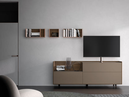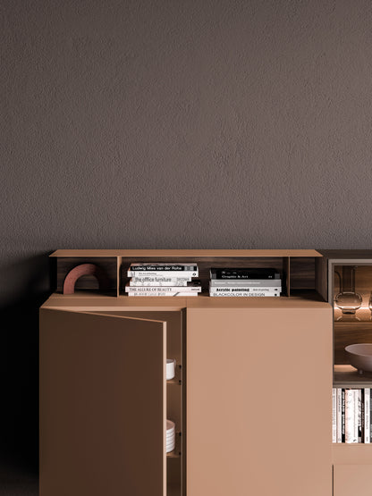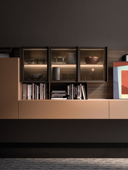 - Finish shown: Lanny open elements in Rame matt lacquer, Modulo units in Cotto with bronzed glass doors, Tray sideboard in Terra matt lacquer and Cotto, Casellari unit in Rame matt lacquer