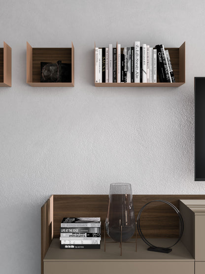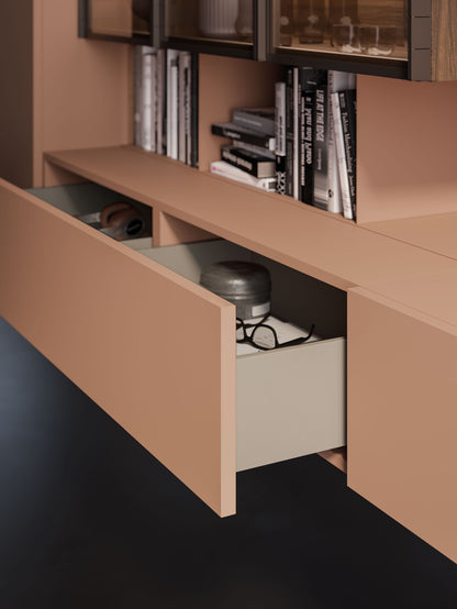 Lanny open elements in Rame matt lacquer bring warmth and depth, complemented by a Modulo drawer unit that blends seamlessly with the overall design. The Modulo wall units introduce striking character with a Cotto textured finish, burnished metal frames, and bronzed glass doors. Backlit glass shelves enhance the textures, adding a layer of subtle sophistication. The Tray sideboard, finished in Terra matt lacquer and Cotto texture, integrates a practical TV pole and a Tiglio burnished metal base. Completing the ensemble, the Casellari Unit in Rame matt lacquer and textured Cotto ties all elements together into a unified composition.