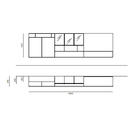Guide price is based on the composition shown: L 3900 × H 1104 × W 250–478 mm in Melamine or Neutral finishes. Pricing may vary depending on size, finishes, and accessories. Optional extras include LED lighting, additional shelving, internal drawers, or custom handles. Each unit is made to order and fully customisable to suit your space.