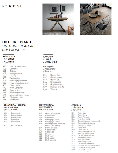 The Genesi, in its maximum extension, takes advantage of central support that ensures a solid support base without compromising the aesthetic strength that characterises the shapes and accompanies the careful study of the factors related to ergonomics. Extendable console with metal structure and aluminium telescopic mechanism. Top in melamine, lacquer, wood or mortar effect. Available with three or five extensions and always equipped with central support legs.