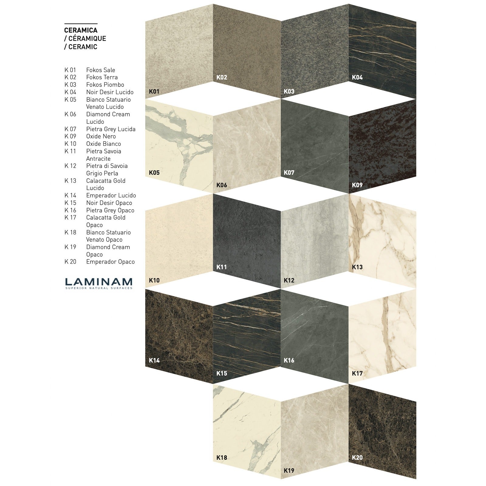 - In the picture Giada AT124/140 with structure in embossed lacquered Black M04 and Top in Laminam Ceramic Pietra di Savoia Matt Pearl K12