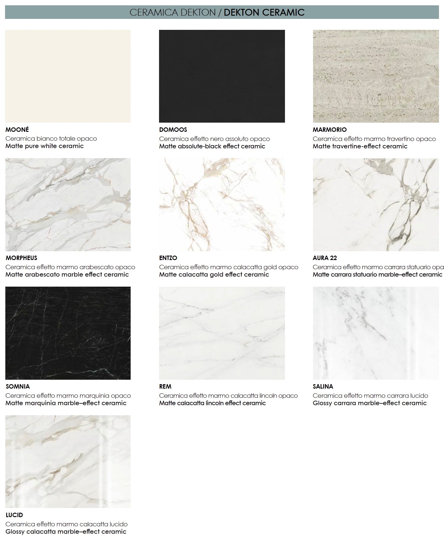 - Dekton Ceramic (20 mm) – Superfici ultracompatte e ad alta resistenza, progettate per resistere a graffi, macchie, calore ed esposizione ai raggi UV. Disponibili nei colori Sirius, Mooné, Rem, Entzo, Kira e Morpheus.