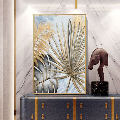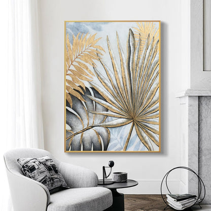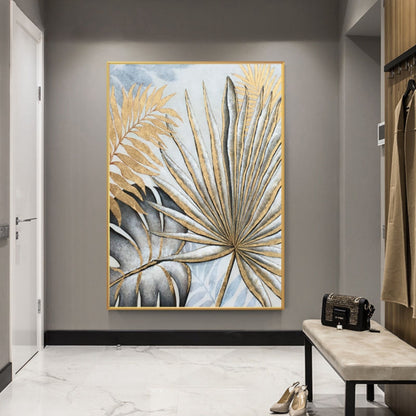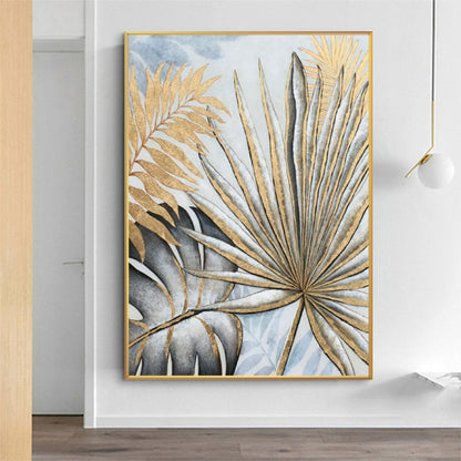Minimalist gold and grey leaves painting on canvas - Hand made