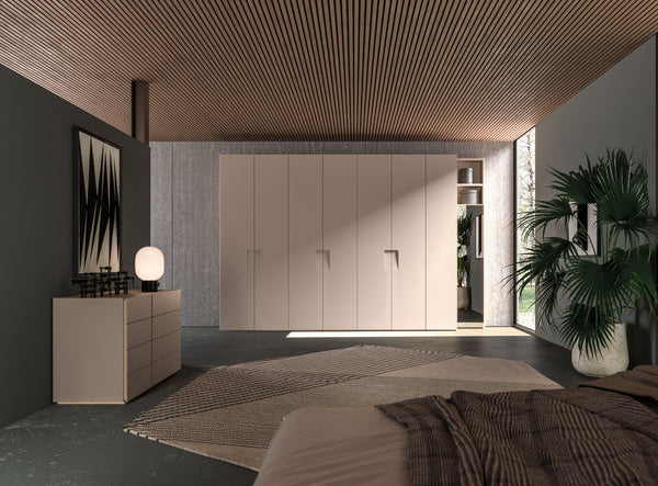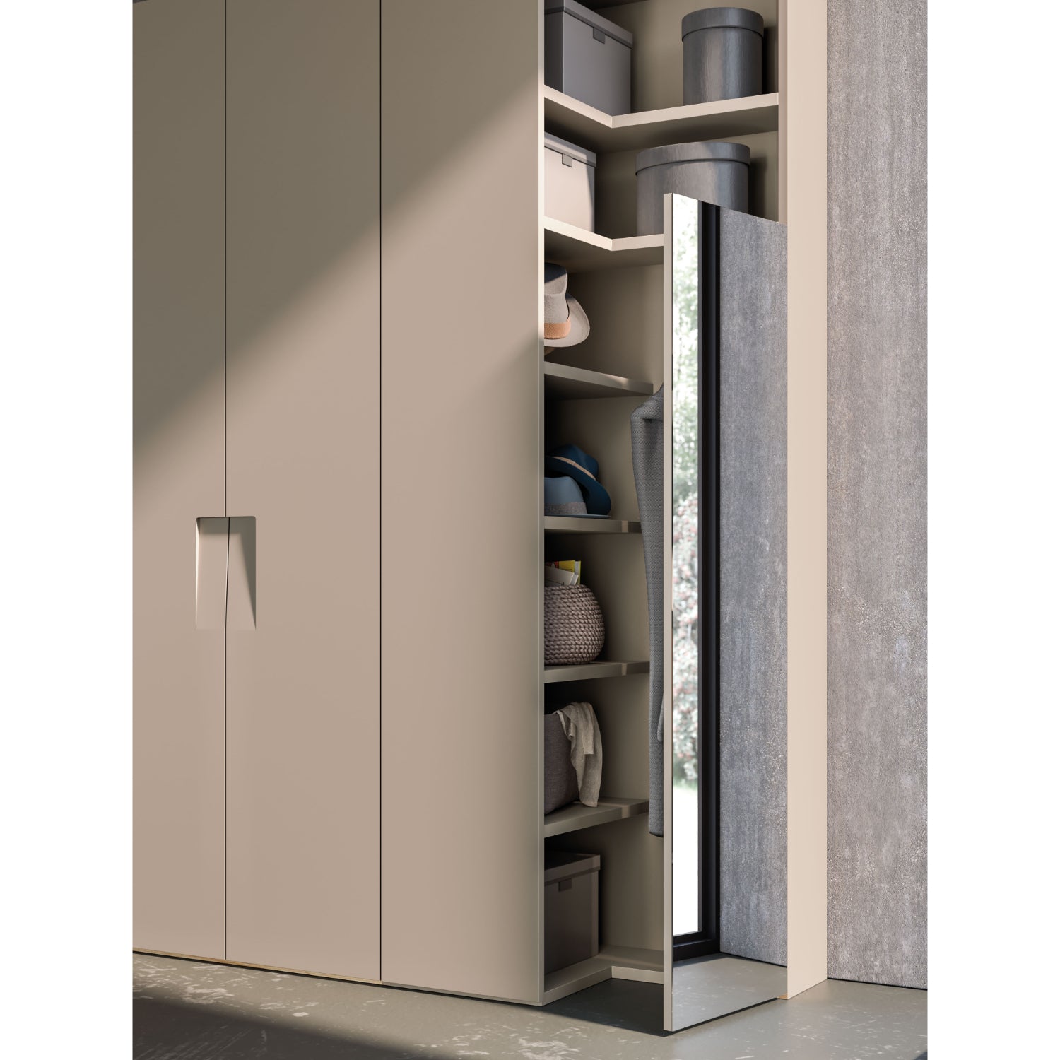 The Cotone finish inside offers a soft, textile-inspired texture with excellent durability. Adjustable layouts with rails, shelves, and compartments make it easy to organise clothing and accessories while maintaining an uncluttered look. The full-length mirror panel not only expands visual space but also adds practicality for daily routines.