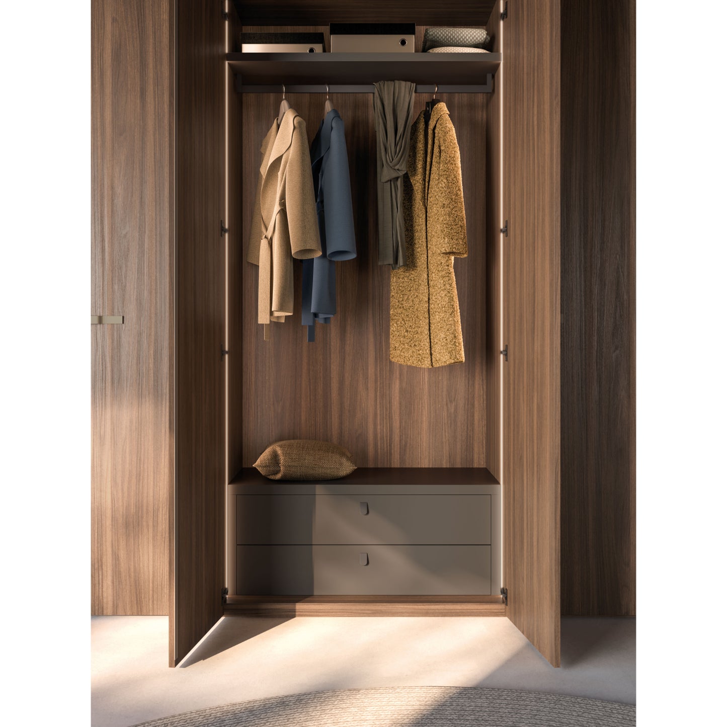 Inside, the Cotto materic finish continues across the internal structure for a seamless aesthetic. Generous space and flexible layouts—hanging rails, shelves, and drawer packs—make organisation simple without compromising on style or durability.