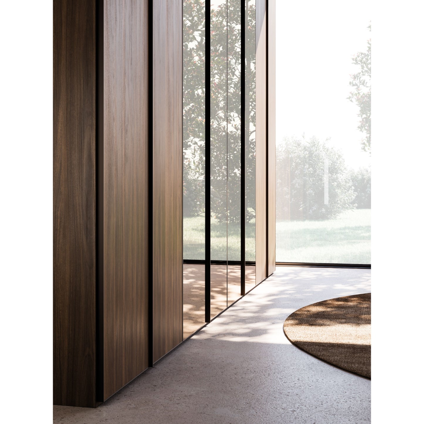 Noto doors in tactile Cotton materic with bronzed glass inserts and a warm Cotton interior. -