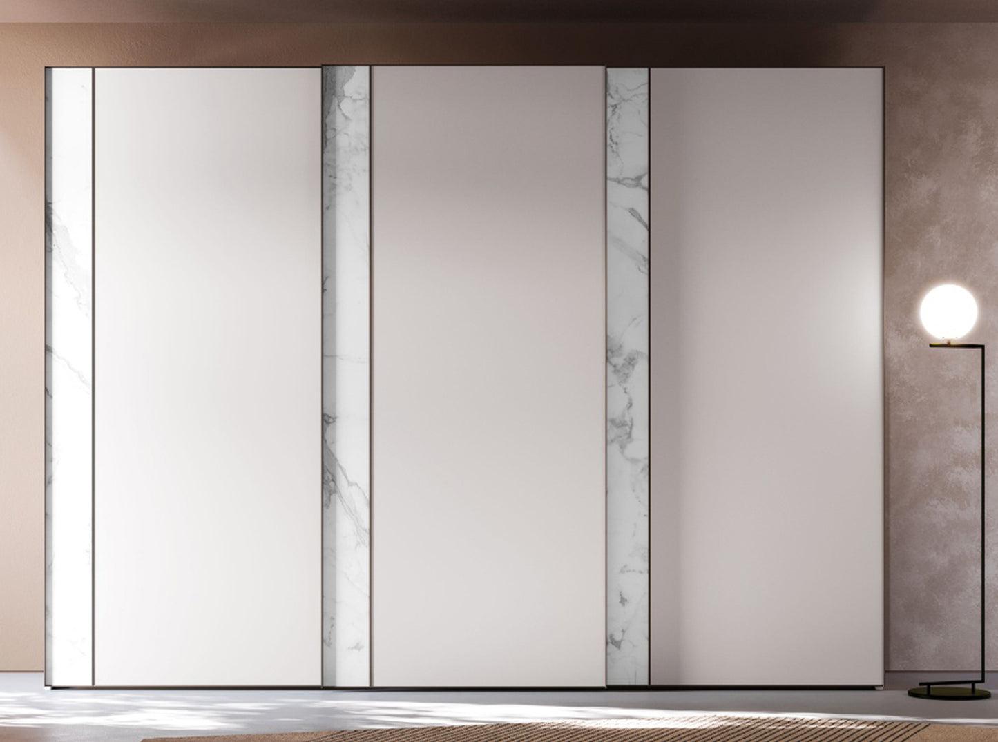 The doors combine Seta melamine for durability and elegance with vertical inlays in Apuano marble melamine, creating a striking contrast. These finishes bring refinement and luxury, forming a cohesive design that balances practicality with style.