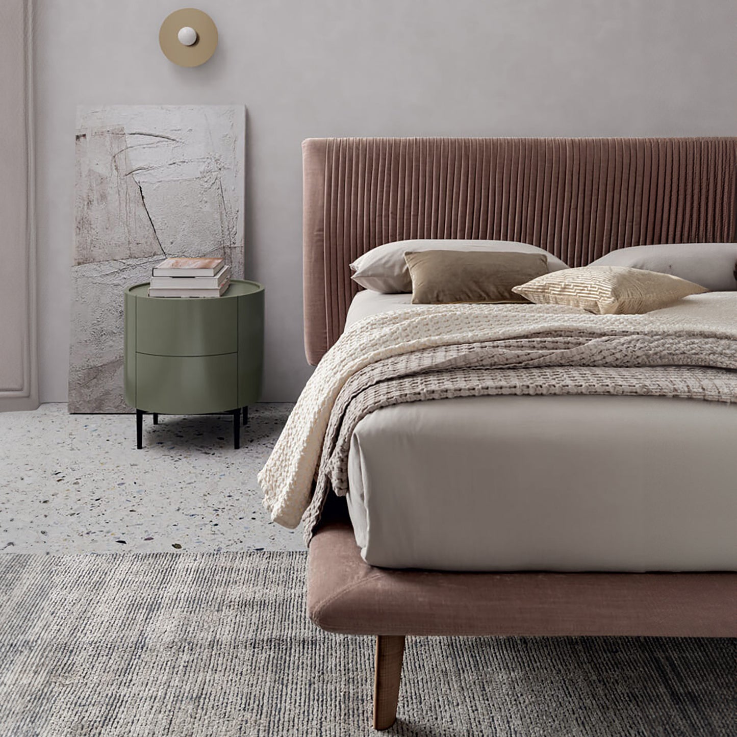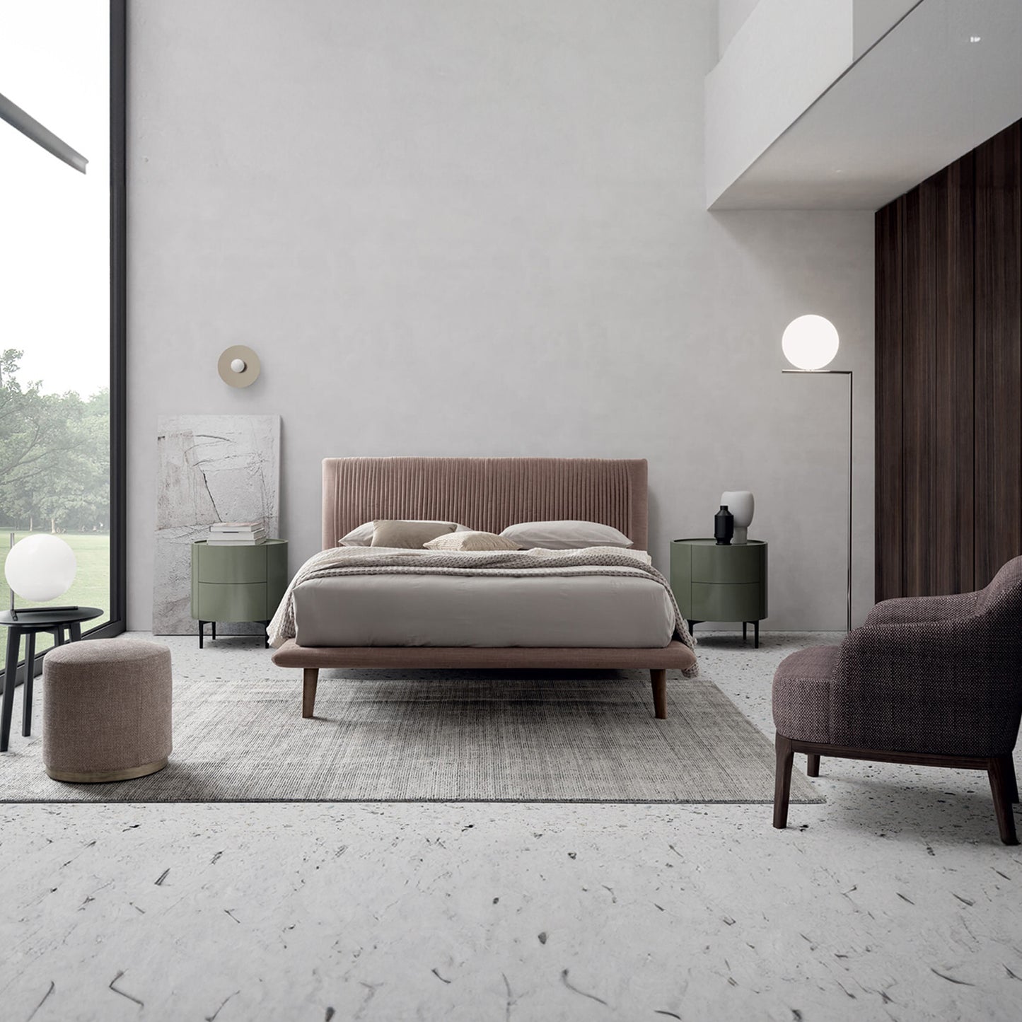 Upholstered Bed with Removable CoverDiscover the elegance of the Plisse bed, featuring a unique headboard adorned with thick vertical pleats. Its fully removable cover and upholstered bed frame, matched with varying feet materials and finishes, offer versatility and style. Elevate your bedroom's character with the perfect pairing of the Ronda bedside table, making a statement that reflects your personality.