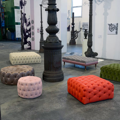 The pouf is adorned with red dacron, enhancing its visual appeal and sophistication. The superb button tufting adds a touch of classic charm, creating an exquisite square form that elevates the aesthetic of any room. Immerse yourself in luxury with the Domingo Salotti Pouf. The combination of quality craftsmanship and thoughtful design results in a piece that not only captivates with its aesthetics but also offers a comfortable seating experience.