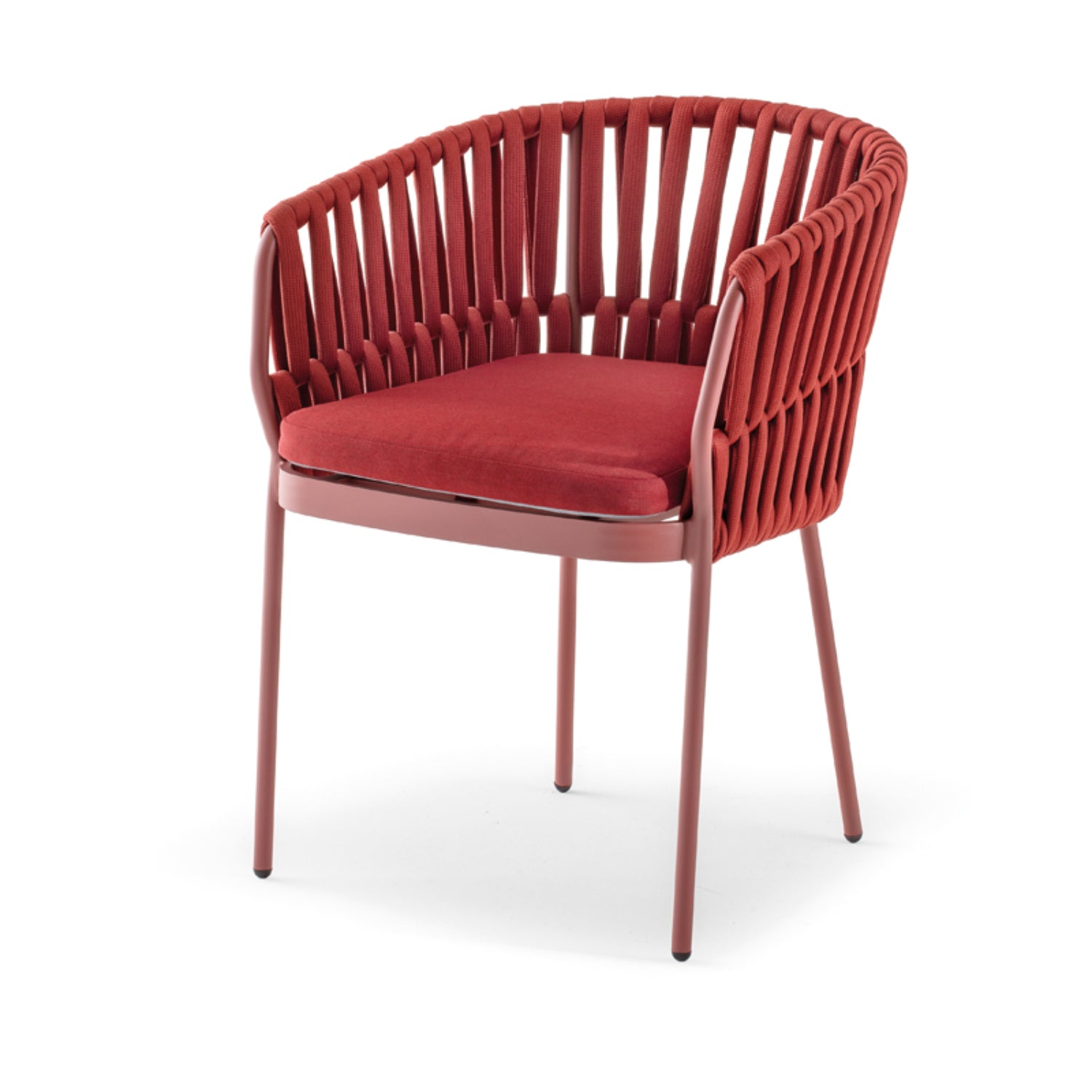 - Aluminium stackable armchair covered with acrylic rope, upholstered cushion with olefin fabric