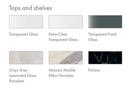 - Top: Glass V0081, Fume V0085, Extra Clear V0100, Beveled Extra Clear Transparent V100B and Ceramic in Grey Onyx V073P, Glossy Portoro Porcelain V085P and Matt White 0001