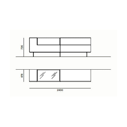 - Design details: Shoulder system with open compartments, drawers, and glass elements