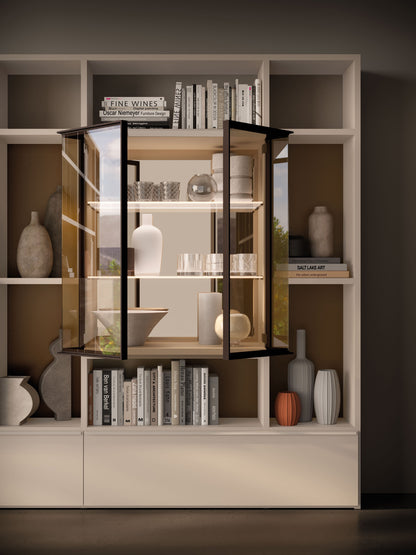 - Finish shown (images): Bookcase in Tortora melamine, Cumino lacquered backs, Carbone wall units, bronzed glass elements