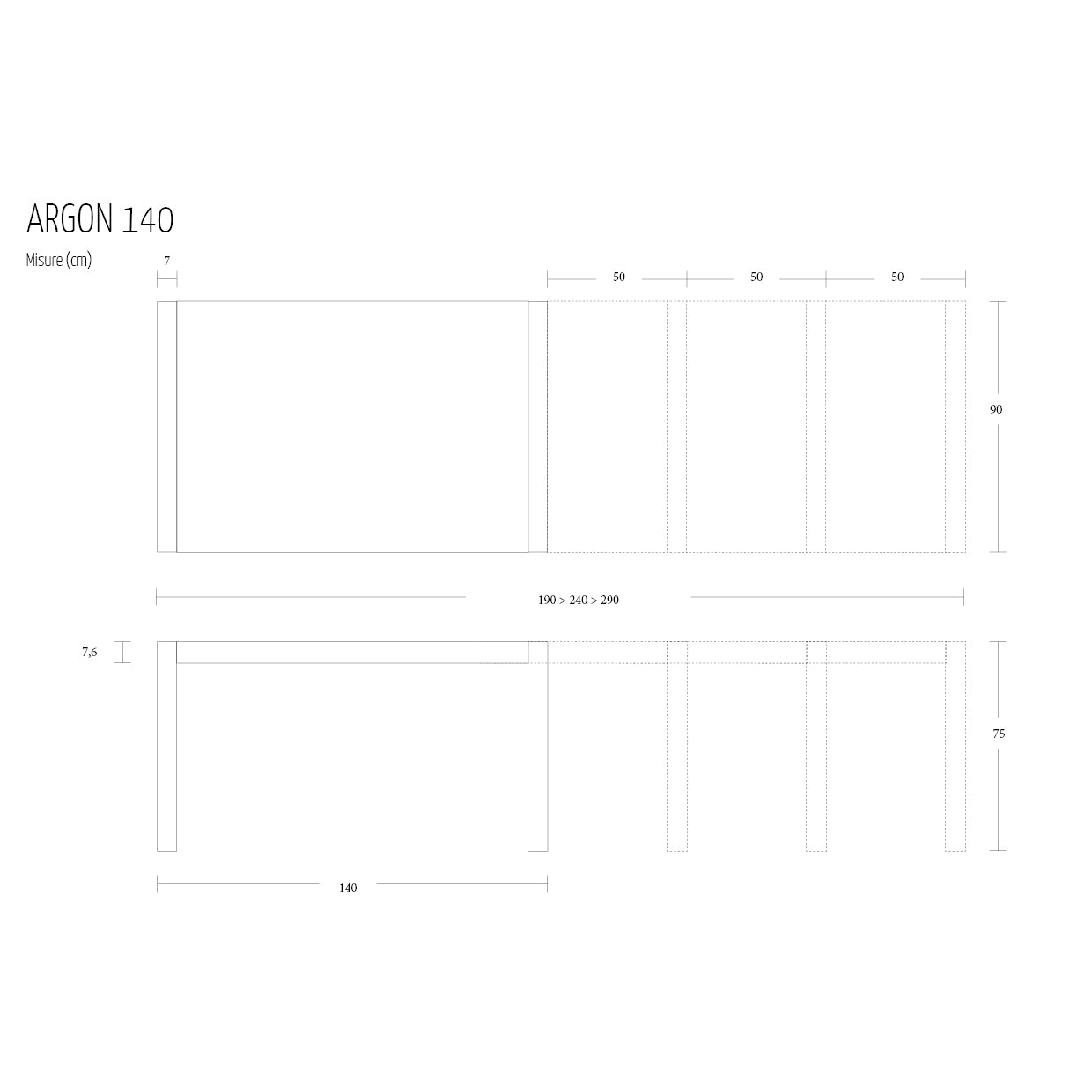 Argon 140: L 140-290 H 75 W 90 cm