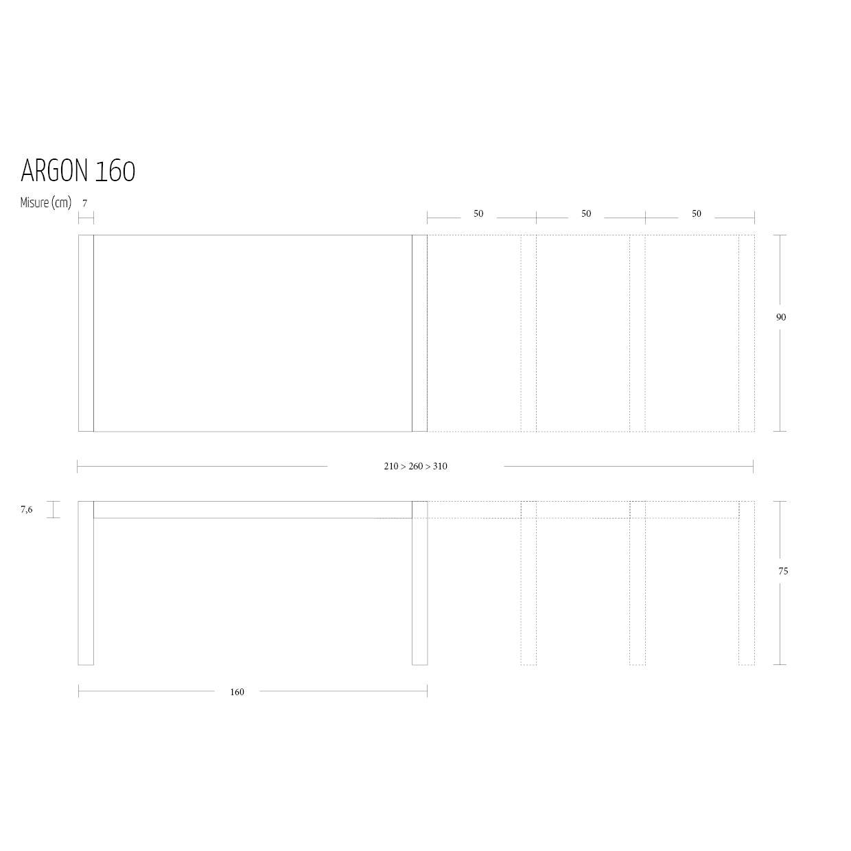 Argon 160: L 160-310 H 75 W 90 cm