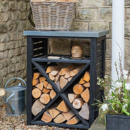 Crafted from durable and weatherproof spruce, this design is not only practical but also aesthetically pleasing. The addition of a top shelf provides a convenient space for kindling stockpiling, while the galvanised sheet metal top adds sturdiness, doubling as an extra shelf for versatile use - whether it's for additional logs or displaying an array of charming potted plants.