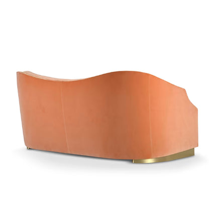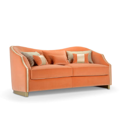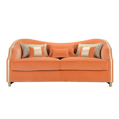 The brilliant orange velvet upholstery adds a touch of opulence, making a bold statement in any room. The two soft, supportive cushions and ornamental pillows contribute to the overall aesthetic, completing the ensemble with a cohesive and inviting allure. With the Cleio Sofa, Domingo Salotti has crafted not just a seating solution but a conversation-worthy centrepiece that effortlessly blends classical inspiration with contemporary luxury.