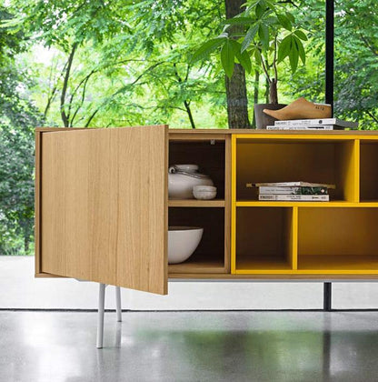 The unit's modular design allows you to customise each of its 4 internal units according to your preferences, ensuring a tailored solution for your storage requirements. The 'Code 7' sideboard is available in a variety of finishes, including wood essence, and options for a matt or glossy lacquered structure. Additionally, you can choose units with doors, drawers, or open shelves to further personalise the functionality and aesthetic of this versatile furniture piece.