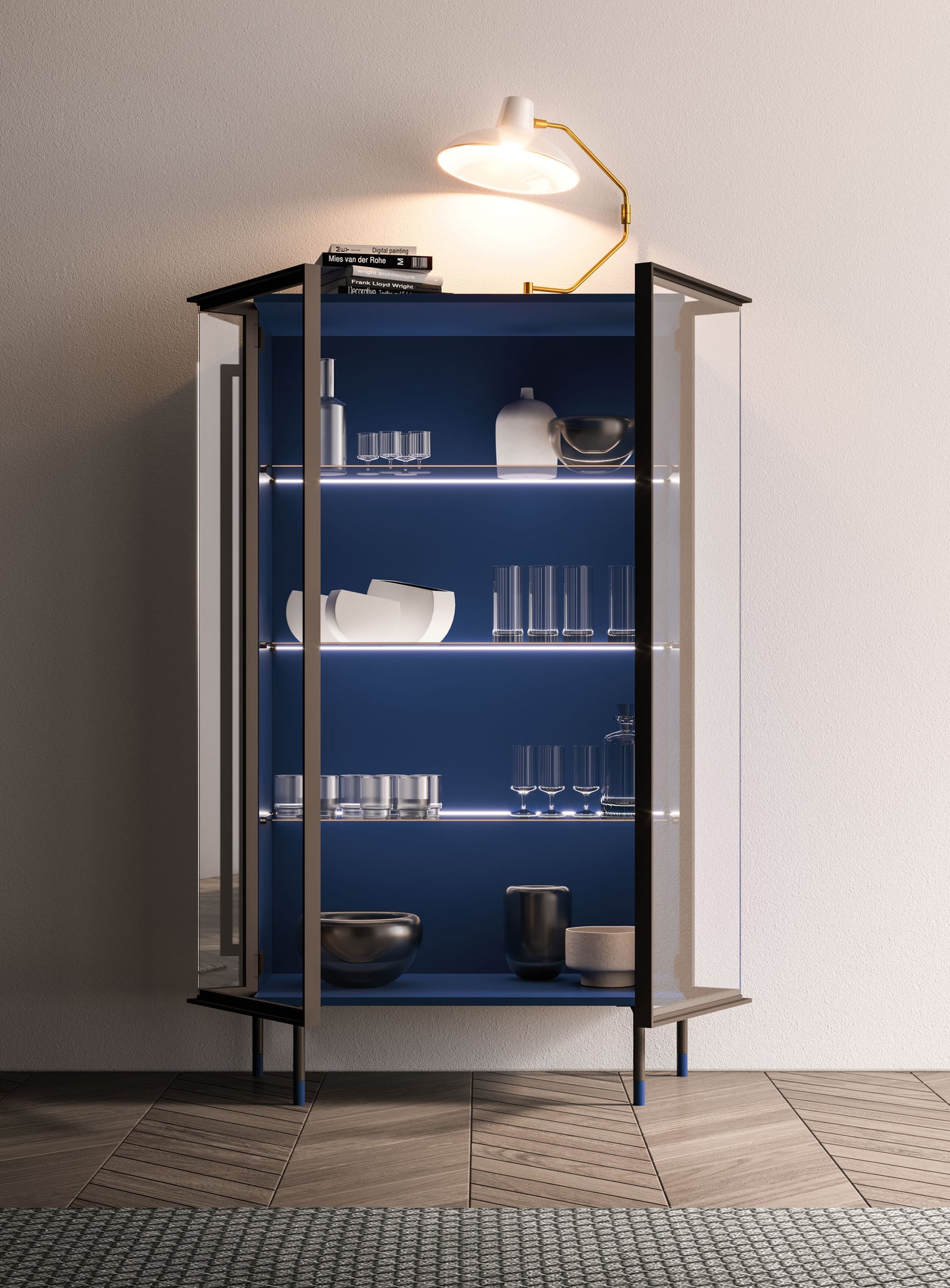 - Piega sideboard with glass doors and Blu matt lacquered details.