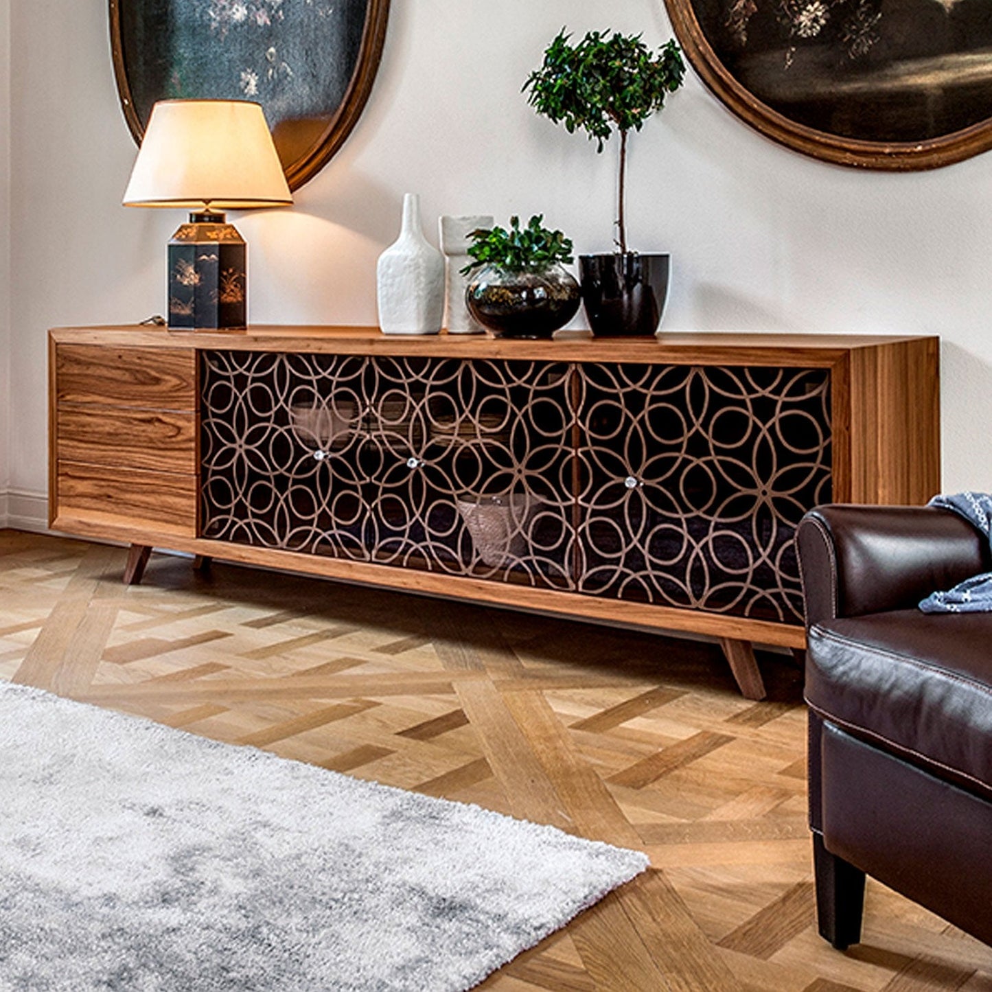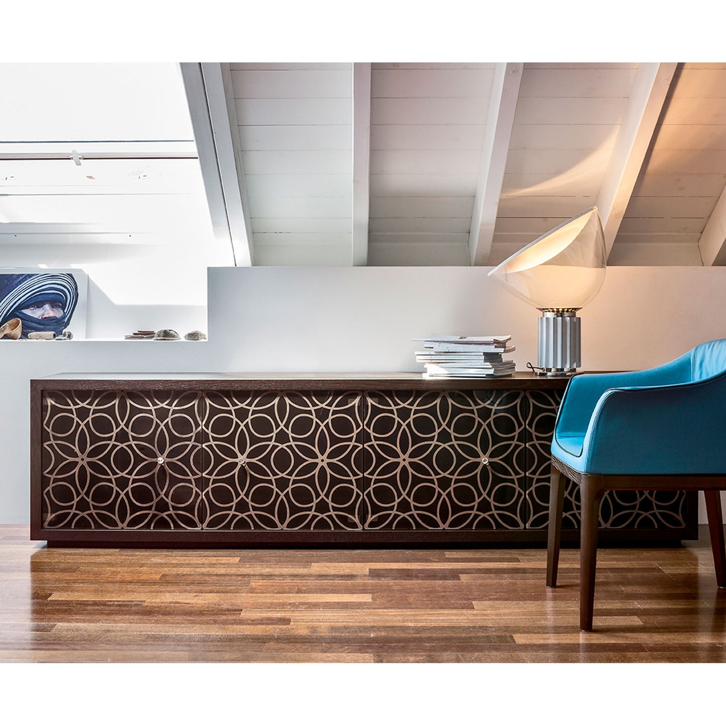 The Granada sideboard by Tonin Casa has baroque patterns that grace the surfaces of rectangular doors, embodying delicate and precise craftsmanship. Within this composition, luxury manifests in its most pristine manifestation - a fusion of glass and wood meticulously adorned, enriched, and elevated to priceless opulence by the resplendent addition of Swarovski doorknobs.
