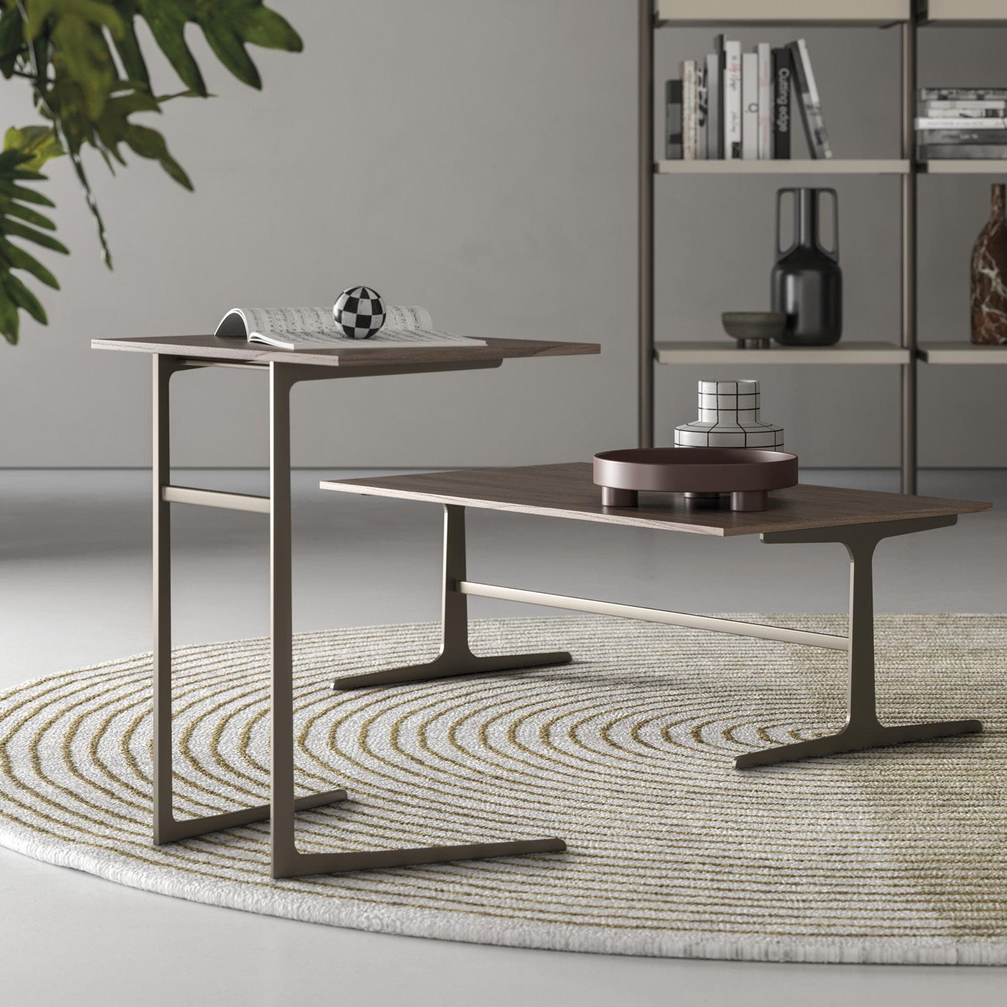 The top shown here in Noce materic finish offers a natural warmth that contrasts beautifully with the burnished metal base. With clean lines and carefully balanced proportions, the Lama 01-23 table functions not only as a practical surface but also as a statement piece, adding depth and refinement to living rooms, lounges, or reading areas.