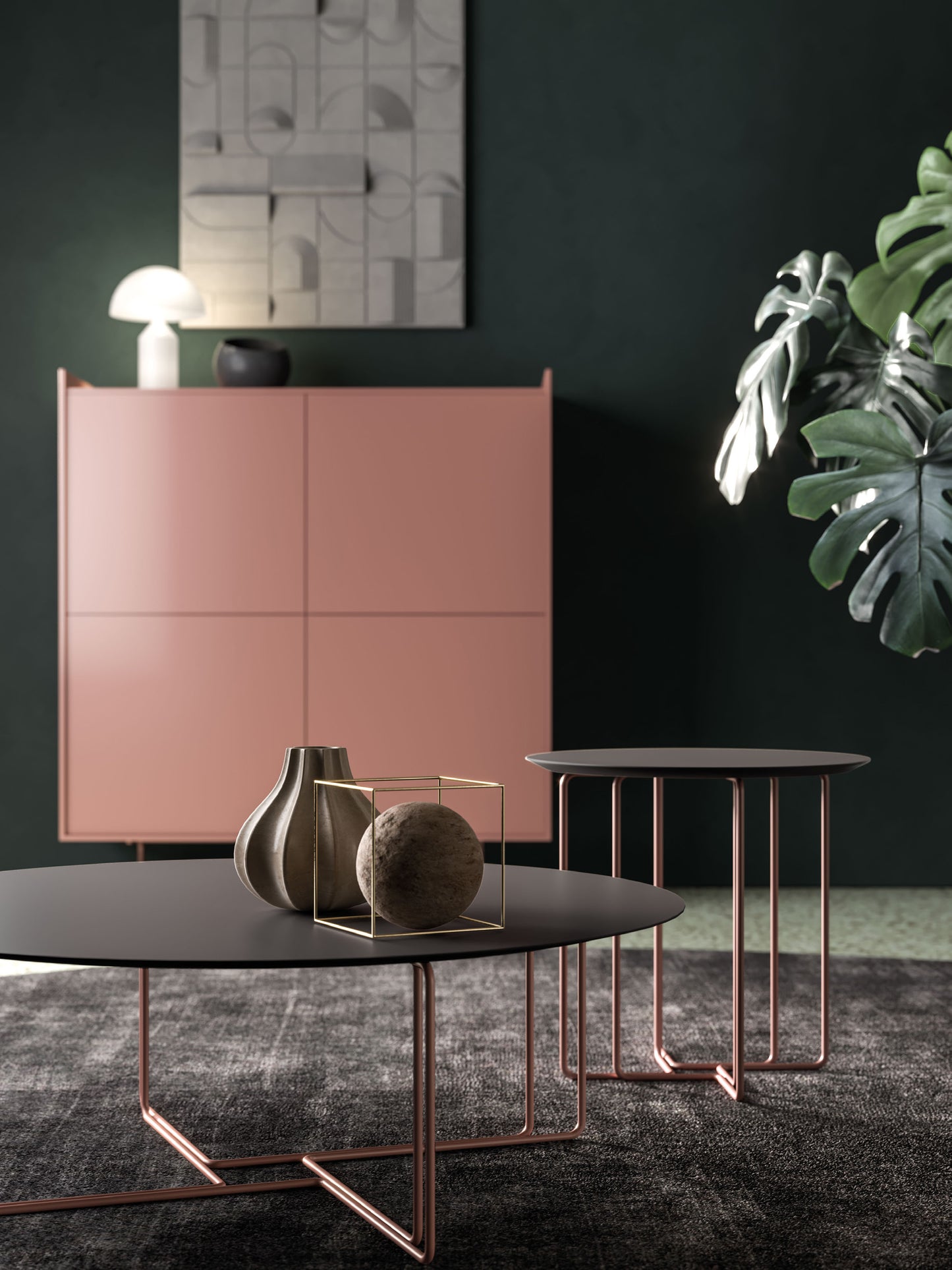 - Finish shown (images): Tray sideboard in Copper metal lacquer with Kako base in Copper metal lacquer; base units in Tufo matt lacquer