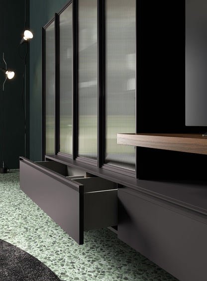 - Design details: Modular suspended/floor bases with drawers and Gola handles in Tufo matt lacquer; wall units with glass doors and Cannete glass